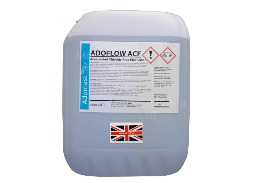 Adomast Adoflow ACF 25 Litre is a specially formulated non-chloride, non-corrosive liquid hardening accelerator, designed as a concrete accelerator and plasticiser. It accelerates the setting time of concrete by speeding the cement hydration process and thus increasing the early-age strength of the concrete.