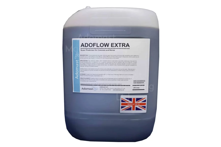 Mixing: ADOFLOW EXTRA is best added during the mixing cycle preferably at the same time as the water. Alternatively it may be added to a normal concrete mix just prior to the pour allowing for a further mixing cycle of at least 2 minutes