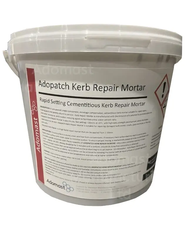 Adomast Adopatch Kerb Repair 8kg is a single-component rapid-setting cementitious repair mortar facilitating quick return to service. The mortar has a working time of 10-15minutes and a setting time of 20-30 minutes at 20oC. It has been developed for the rapid repair of kerb stone, cracks and holes in flooring, walls, stairs and steps. It can be ready for overcoating within 90 minutes. It is suitable for vertical applications – no cracks or sagging. It is shrinkage-compensated and crack-free.